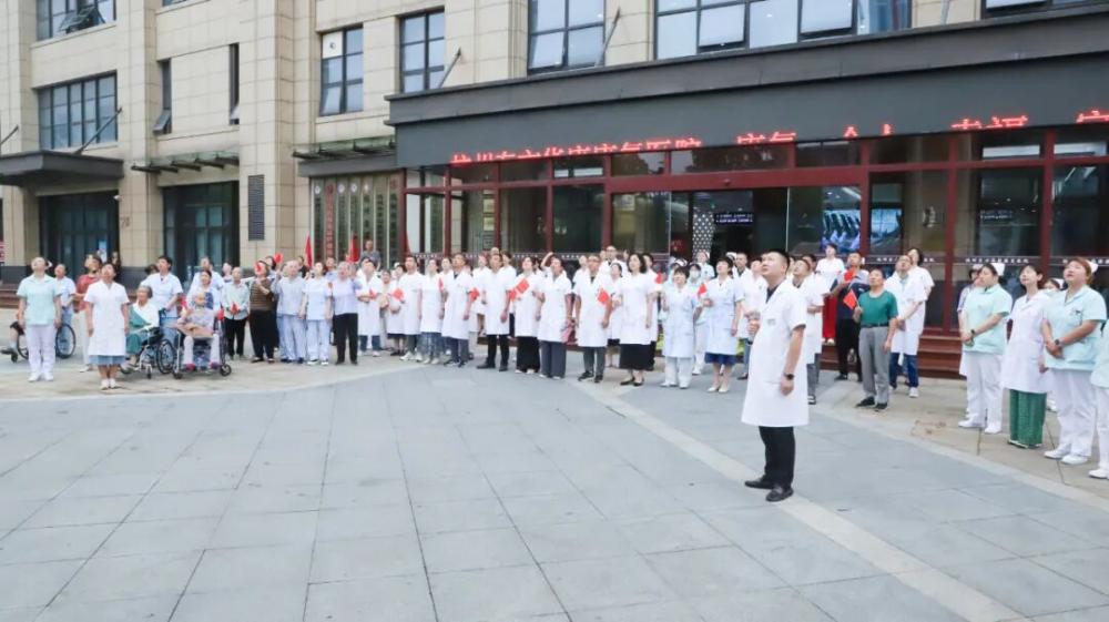 9月29日清晨,杭州金诚护理院在门诊楼前广场举行了庄严的庆国庆升旗仪式,医院领导班子成员、各科室职工代表、部分患者及家属共计100余人参加,共同庆祝中华人民共和国成立76周年。