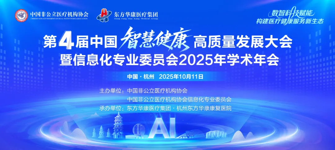 “数智科技赋能,构建医疗健康服务新生态”,2025年10月10-11日,由中国非公立医疗机构协会、中国非公立医疗机构协会信息化专业委员会主办,东方华康医疗集团・杭州东方华康康复医院承办的第四届中国智慧健康高质量发展大会暨信息化专业委员会2025年学术年会,将在杭州白金汉爵大酒店盛大召开。